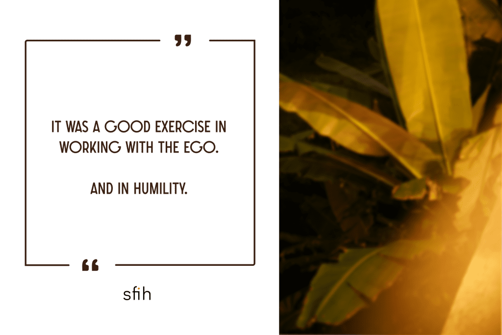 It was a good exercise in working with the ego. And in humility. The work was monotonous, requiring no mental engagement. For me, it became an extension of meditation. I observed my inner dialogue. I watched the changes. I noticed what appeared and what faded away. I tracked my intention. From which universe was I looking at the world?